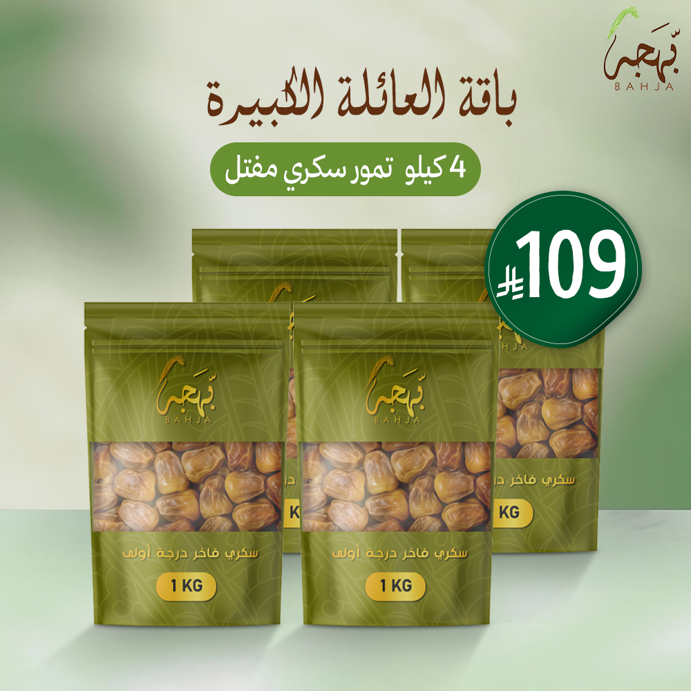 استمتع مع عائلتك بأفضل تمور سكري فاخر من بهجة فارم! اطلب بكجباقة العائلة الكبيرة الآن واستمتع بالطعم الأصيل والطبيعي.